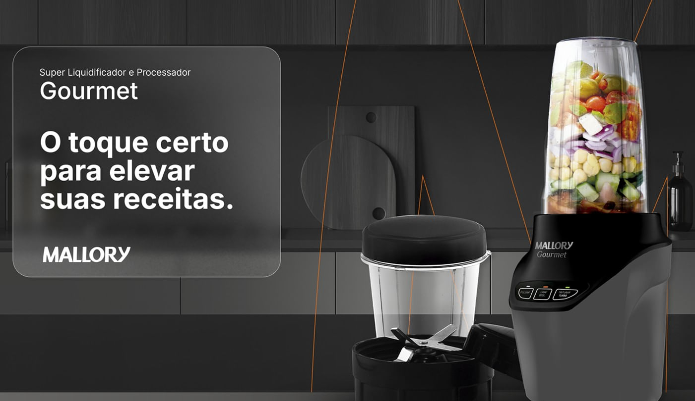 Super Liquidificador e Processador Gourmet da Mallory aproveita 100% dos alimentos com seus 1000W de potência. Possui faca em aço inoxidável de alta resistência, 6 lâminas que trituram gelo e alimentos sem a necessidade de coar. Painel Easy Touch com as funções Pulsar, Misturar e Turbo. Acompanha 02 copos, em TRITAN, que são ultra resistentes. Com tampas para consumo e acondicionamento são ideais para transportar para qualquer lugar. Possui ainda travas de segurança.